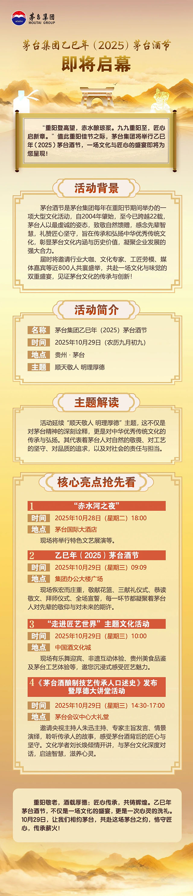 - 2025/10/28·茅臺(tái)集團(tuán)乙巳年(2025)茅臺(tái)酒節(jié)即將啟幕!